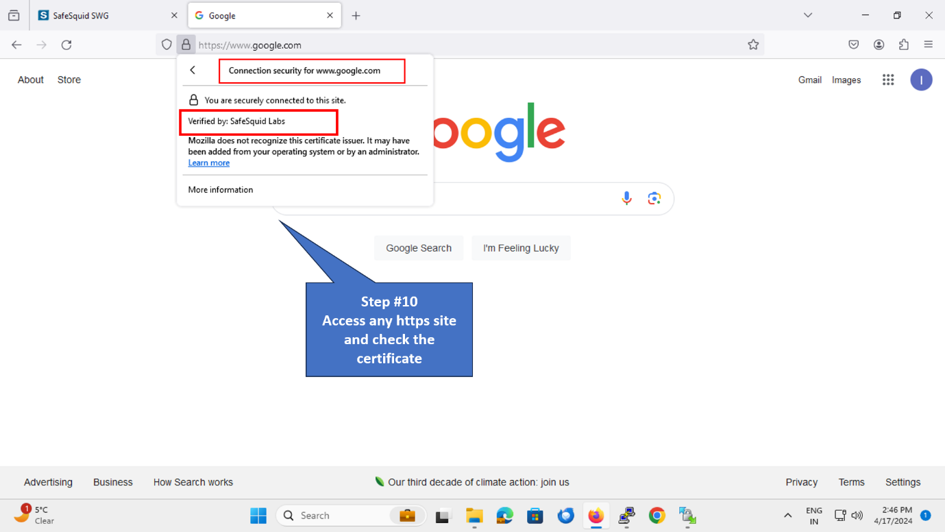 Note: Make sure you must have enabled HTTPS inspection in SafeSquid User Interface before testing.