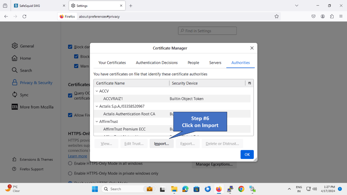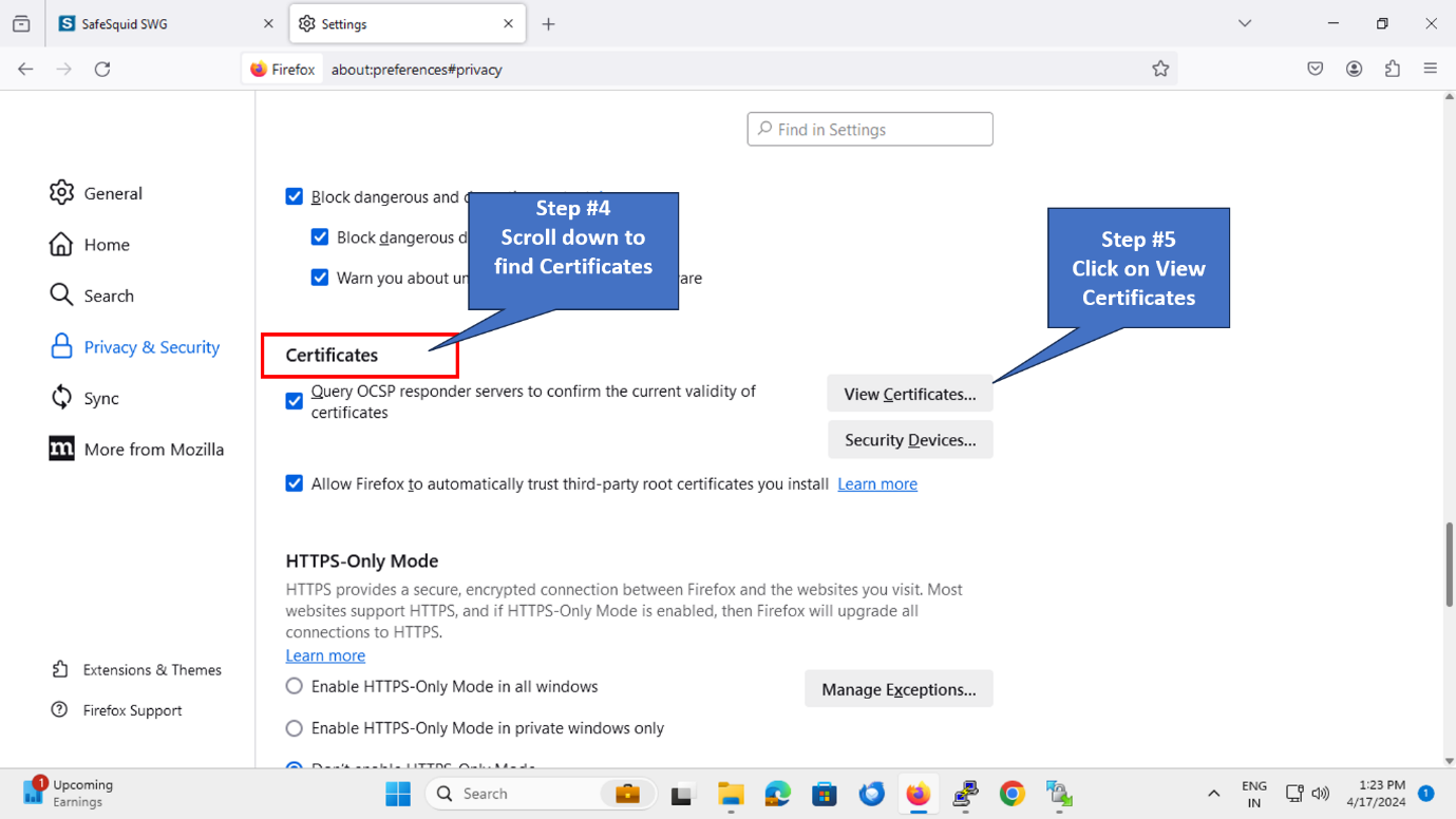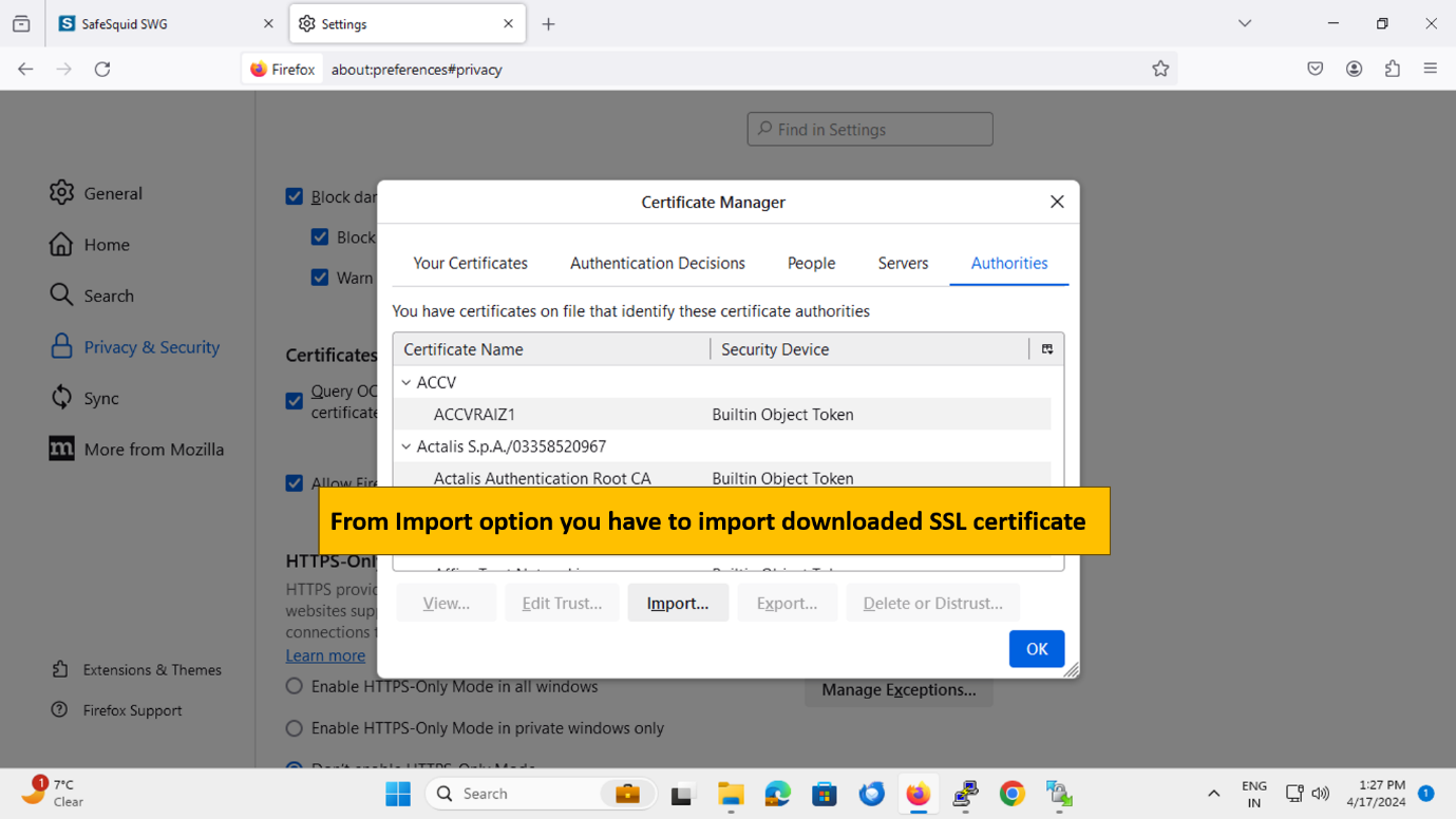 You would need to install SafeSquid SSL certificate in Firefox to allow users to seamlessly browse HTTPS sites. This article will help you with Installation of SafeSquid SSL Certificate into Mozilla Firefox browser.