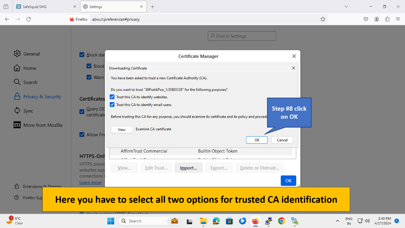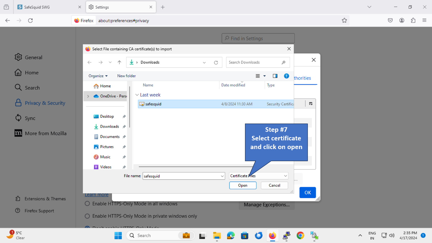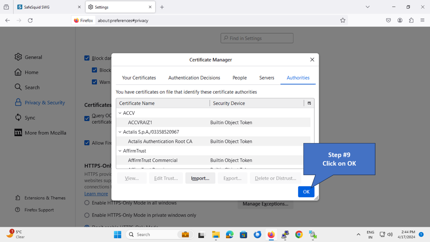 You would need to install SafeSquid SSL certificate in Firefox to allow users to seamlessly browse HTTPS sites. This article will help you with Installation of SafeSquid SSL Certificate into Mozilla Firefox browser.