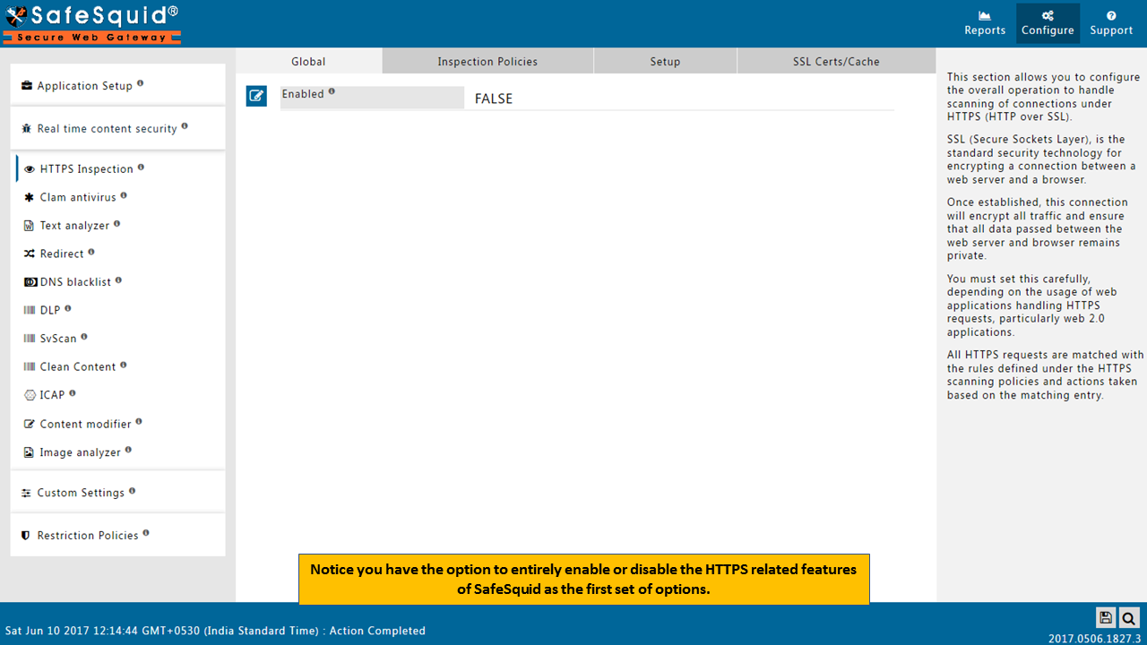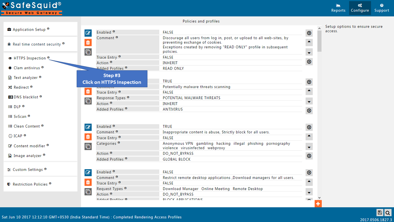 Note: In newer versions of SafeSquid which are released after June-2017, setup tab is removed. You will see only three subsections in HTTPS inspection section.